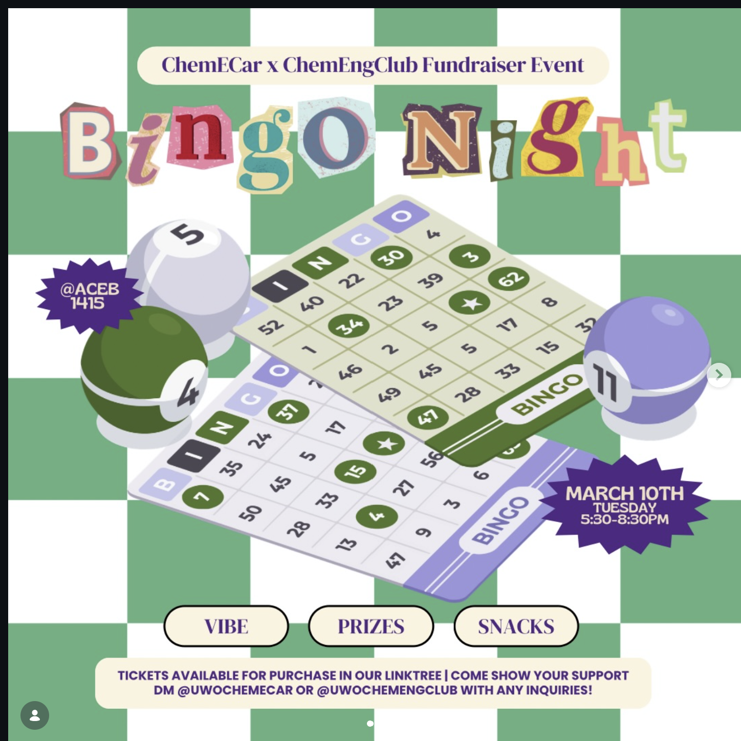 Join ChemECar and the Chemical Engineering Club for an evening of bingo, prizes, snacks, and merch!